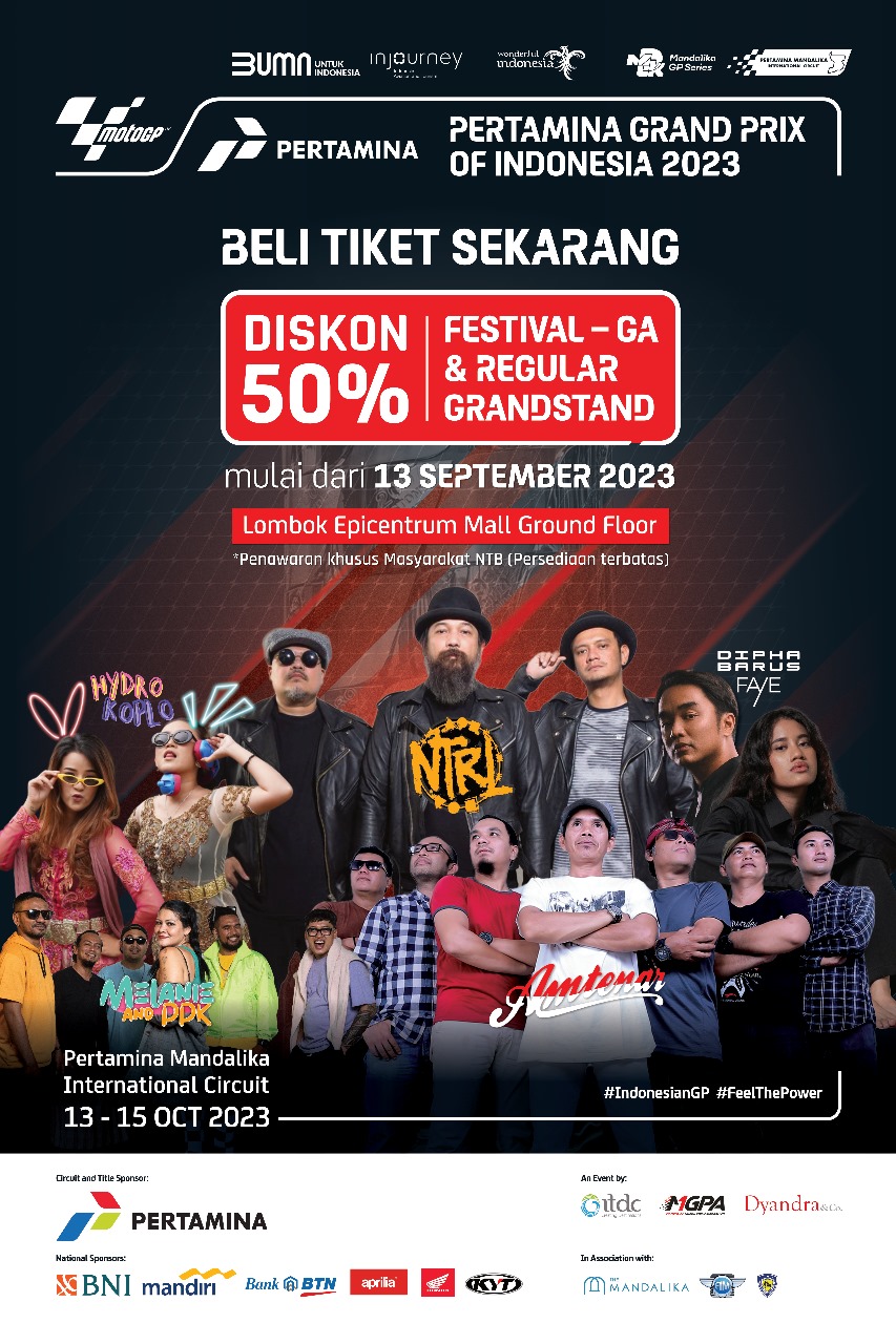 Jakarta, 15 September 2023 — Satu bulan lagi, Pertamina Grand Prix of Indonesia (IndonesianGP) 2023 akan berlangsung di Pertamina Mandalika International Circuit, Lombok Tengah, Nusa Tenggara Barat (NTB). PT MGPA Nusantara Jaya (MGPA) dan Dyandra&Co., sebagai promotor dan co-promotor IndonesianGP 2023, menghadirkan penjualan tiket offline atau Ticket Box di berbagai lokasi, yaitu Kuta Beachwalk Bali pada 13–17 September 2023, Trans Studio Mall Bandung pada 21–24 September 2023, Tunjungan Plaza Surabaya pada 21–24 September 2023, serta Trans Studio Makassar pada 28 September – 1 Oktober 2023. Sementara Ticket Box di Lombok Epicentrum Mall Mataram, yang telah dibuka 2 September lalu dan akan berlangsung sampai 13 Oktober 2023, akan memberikan diskon khusus 50% tiket Regular Grandstand dan General Admission (Festival) . khusus bagi masyarakat NTB, selama persediaan masih ada.