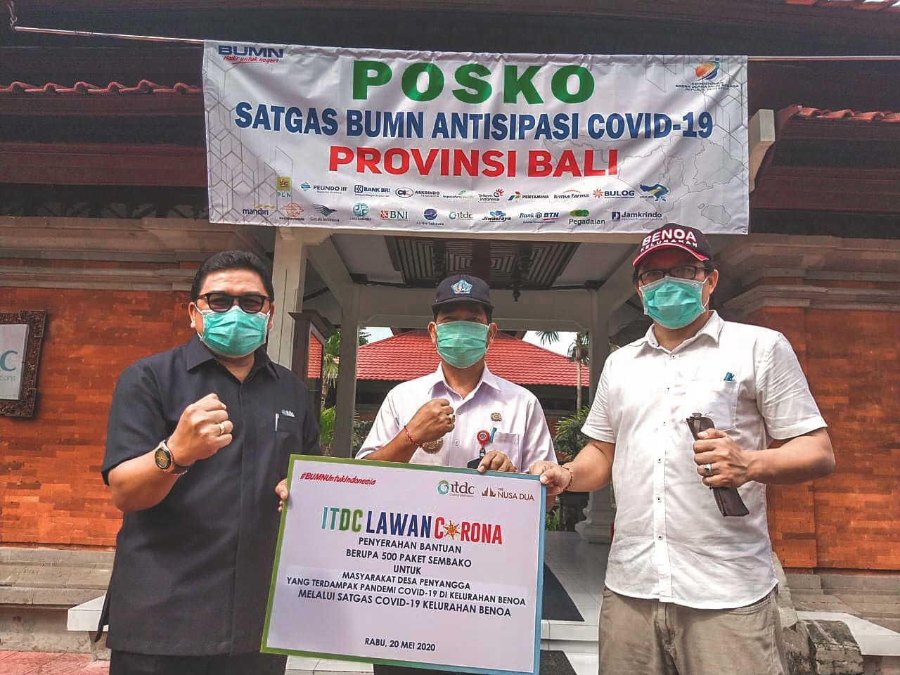 THE NUSA DUA, 20 Mei 2020 – PT Pengembangan Pariwisata Indonesia (Persero)/Indonesia Tourism Development Corporation (ITDC), BUMN pengembang dan pengelola destinasi pariwisata The Nusa Dua, Bali dan The Mandalika, NTB, hari ini menyerahkan 500 paket sembako bagi anggota masyarakat yang paling terdampak pandemi Covid-19 di tiga desa penyangga The Nusa Dua, yaitu Desa Adat Bualu, Peminge, dan Kampial di Kelurahan Benoa, Kecamatan Kuta Selatan, Kabupaten Badung Bali. Bantuan merupakan bagian dari rangkaian kegiatan ITDC Lawan Corona, Program Kemitraan dan Bina Lingkungan (PKBL) yang digelar ITDC dalam mendukung pencegahan penyebaran virus Corona atau COVID-19 di lingkungan masyarakat desa penyangga.