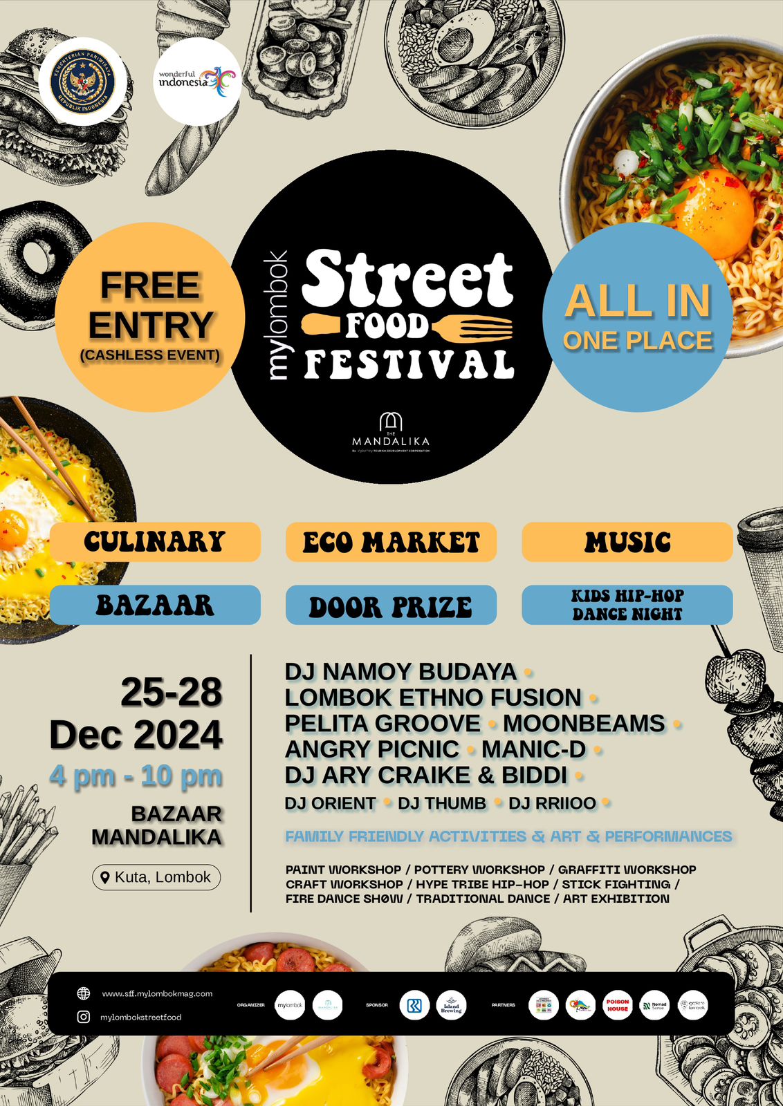 The Mandalika, 18 Desember 2024 – Dalam rangka memeriahkan perayaan Natal dan Tahun Baru di The Mandalika, Lombok, PT Pengembangan Pariwisata Indonesia atau ITDC bersama MyLombok Magazine akan menghadirkan MyLombok Street Food Festival. Acara ini akan berlangsung selama empat hari penuh, mulai tanggal 25-28 Desember 2024, di Bazaar Mandalika, kawasan The Mandalika, Kuta, Lombok Tengah, Nusa Tenggara Barat (NTB).