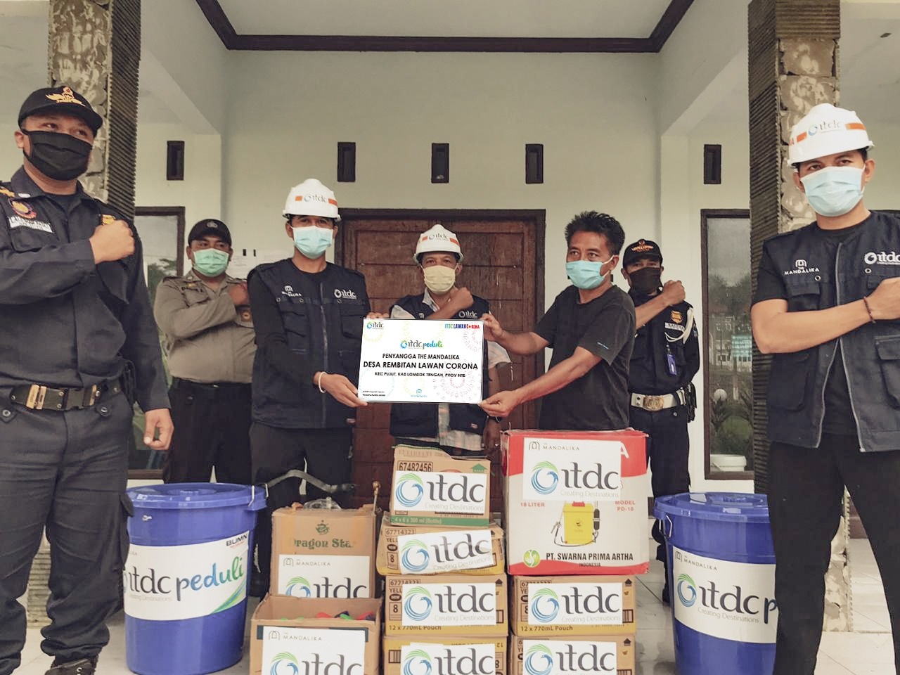 Enam Desa Penyangga yang menerima penyaluran bantuan dari porgam ITDC Lawan Corona ini mencakup Desa Rembitan, Desa Kuta, Desa Sengkol, Desa Sukadana, Desa Mertak, dan Desa Prabu pada Minggu (12/4). Bantuan periode ke-2 ini terdiri dari set station cuci tangan dan 20 hingga 25 liter cairan disinfektan disesuaikan kebutuhan desa terkait. Khusus Desa Rembitan mendapatkan bantuan tambahan berupa 4 (empat) set Alat Pelindung Diri (APD) lengkap dengan goggle penutup wajah, masker N95, set baju Hamzat, set helm, set sepatu, dan set sarung tangan, diperuntukkan bagi petugas Palang Merah Indonesia di Rumah Karantina Kabupaten Lombok Tengah yang berlokasi di desa tersebut.