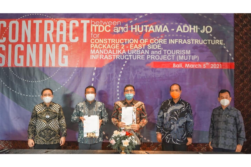 The Nusa Dua, 05 Maret 2021 — Pada hari ini, Jumat (5/03/2021), PT Pengembangan Pariwisata Indonesia (Persero) atau Indonesia Tourism Development Corporation (ITDC) selaku BUMN pengembang dan pengelola The Nusa Dua, Bali dan Kawasan Ekonomi Khusus (KEK) Mandalika/The Mandalika, Lombok, NTB bersama Joint Operation PT Hutama Karya (Persero) – PT Adhi Karya (Persero), Tbk (JO HUTAMA-ADHI) menandatangani Kontrak Paket II Mandalika Urban Tourism and Infrastructure Project (MUTIP) untuk pembangunan infrastruktur dasar di area Timur The Mandalika. Penandatanganan dilakukan oleh Direktur Utama ITDC Abdulbar M. Mansoer selaku pemberi kerja dan Authorized Representative/perwakilan resmi JO HUTAMA – ADHI Ir. Ari Asmoko, disaksikan oleh Direktur Teknik dan SDM ITDC Taufik Hidayat, Direktur Operasi I PT Hutama Karya (Persero) Novias Nurendra, serta Direktur Operasi I PT Adhi Karya (Persero), Tbk. A. Suko Widigdo, bertempat di The Maj Nusa Dua, kawasan pariwisata The Nusa Dua Bali.