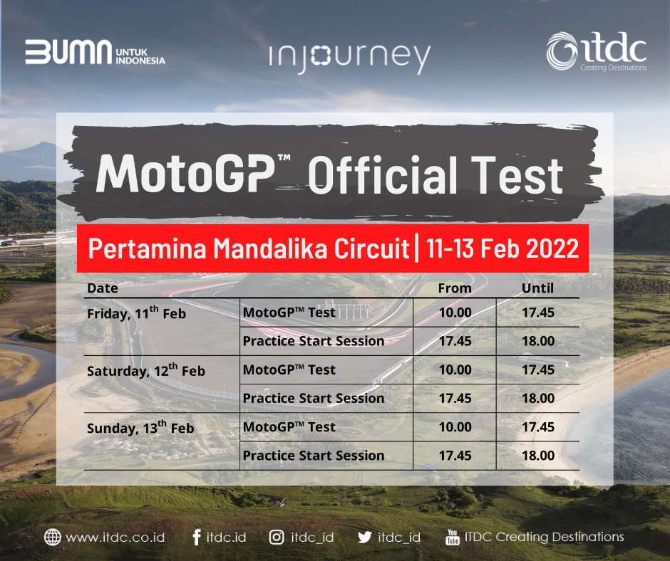 The Mandalika, 6 Februari 2022 – Setelah Sepang, MotoGP Official Test akan berlangsung di Pertamina Mandalika Circuit pada 11-13 Februari 2022 mendatang. Sebanyak 24 pembalap dari 12 tim balap MotoGP dipastikan siap tampil di Pertamina Mandalika Circuit, Lombok, NTB yang dikelola oleh PT Pengembangan Pariwisata Indonesia (Persero)/Indonesia Tourism Development Corporation (ITDC), BUMN Pengelola Kawasan Ekonomi Khusus (KEK Mandalika)/The Mandalika bersama dengan Mandalika Grand Prix Association (MGPA) selaku bagian dari ITDC Group. Kepastian ini diperoleh dari International Road racing Team Association/ Asosiasi Tim Balap Internasional (IRTA).