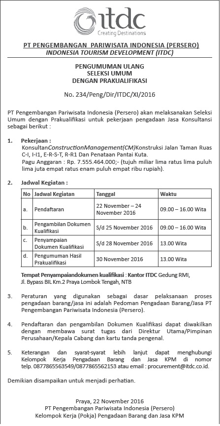 ANNOUNCEMENT GENERAL SELECTION WITH PRAKUALIFICATION NO.234 / PENG / DIR / ITDC / XI / 2016