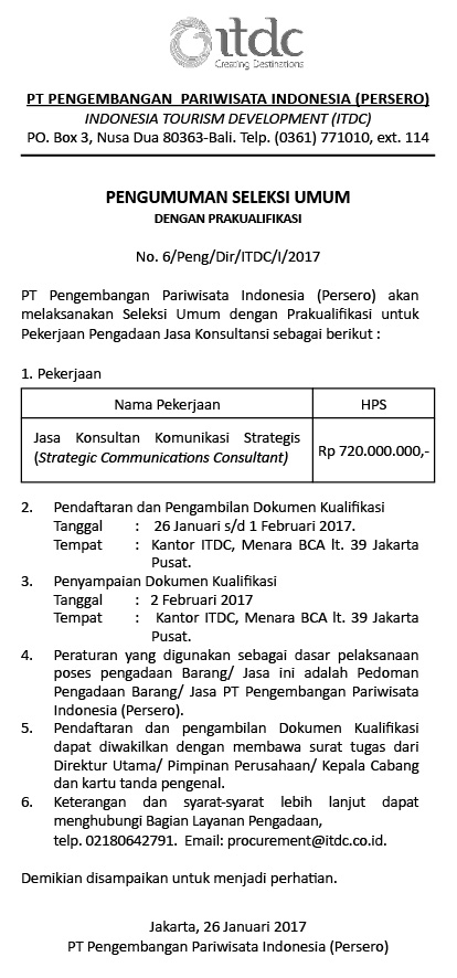 ANNOUNCEMENT OF GENERAL SELECTION WITH PREQUALIFICATION NO. 6 / PENG / DIR / ITDC / I / 2017