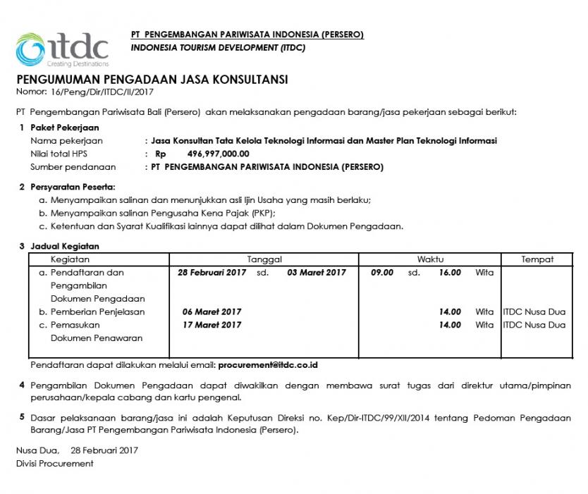 ANNOUNCEMENT OF PROCUREMENT IT SERVICES CONSULTANCY AND IT PLAN MASTERS