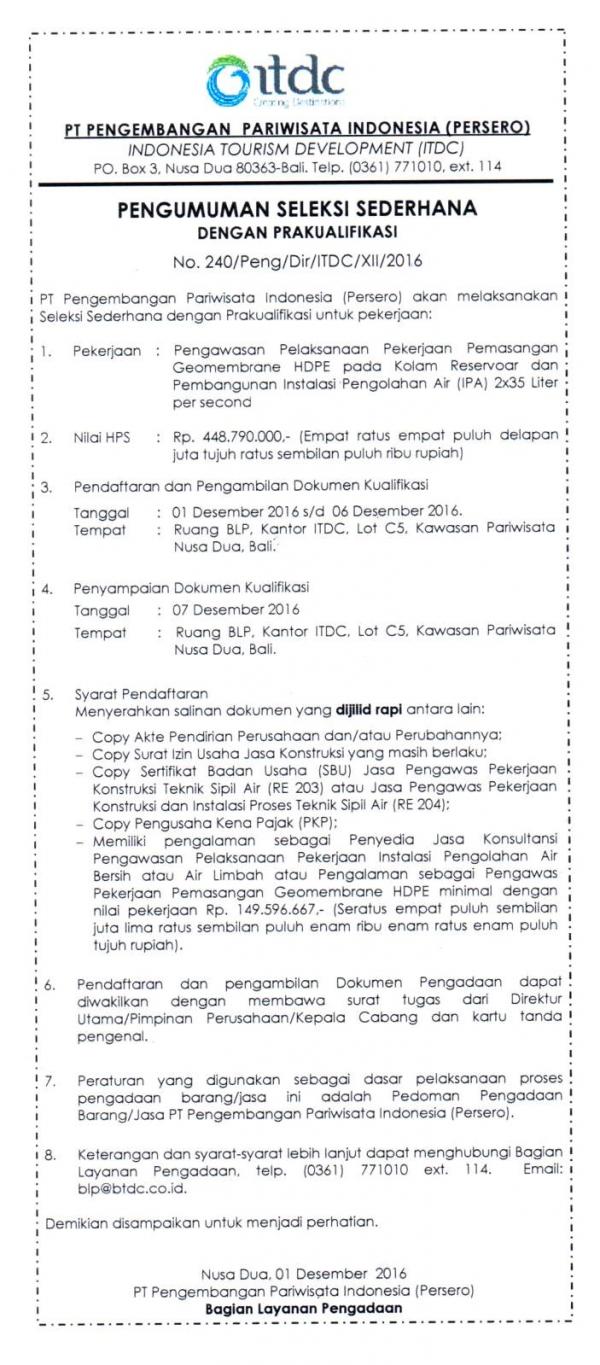ANNOUNCEMENT OF SIMPLE SELECTION WITH PREQUALIFICATION NO. 240 / PENG / DIR / ITDC / XII / 2016