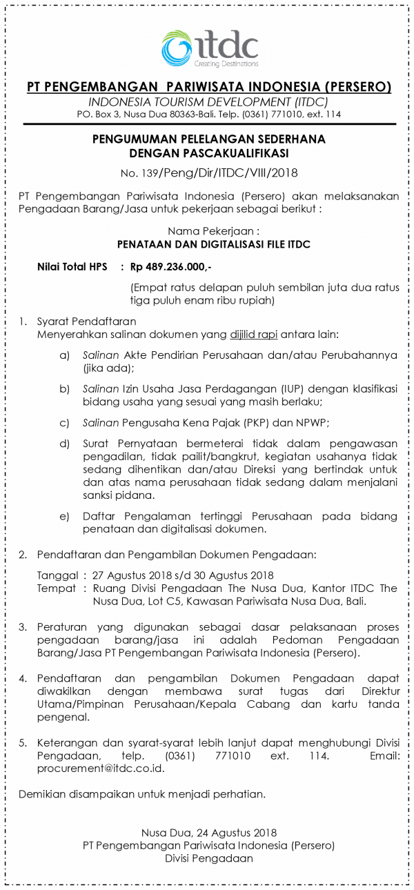 ANNOUNCEMENT OF SIMPLE TENDER WITH POST-QUALIFICATION NO. 139 / Peng / Dir / ITDC / VIII / 2018