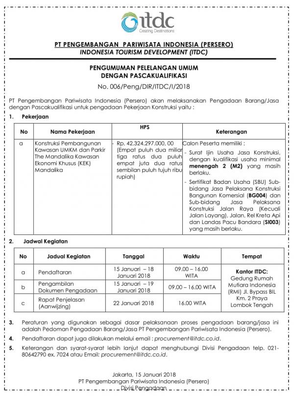 ANNOUNCEMENT OF GENERAL AUCTION WITH POST QUALIFICATION No. 006 / Peng / DIR / ITDC / I / 2018