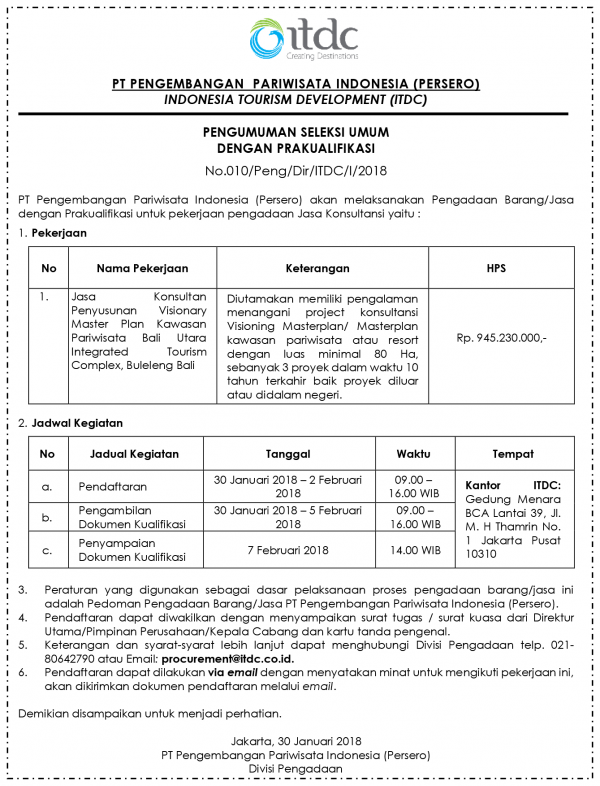 ANNOUNCEMENT OF GENERAL SELECTION WITH PREQUALIFICATION No.010 / Peng / Dir / ITDC / I / 2018