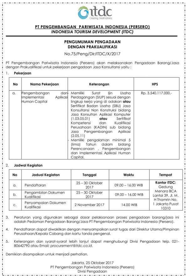 ANNOUNCEMENT OF PROCUREMENT WITH PRA-QUALIFICATION No. 75 / Peng / Dir / ITDC / X / 2017