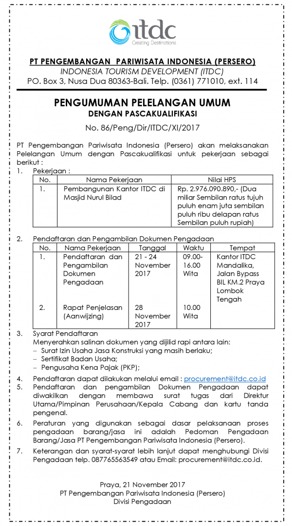 ANNOUNCEMENT OF GENERAL AUCTION WITH POST QUALIFICATION No. 86 / Peng / Dir / ITDC / XI / 2017