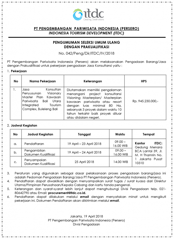 ANNOUNCEMENT OF PUBLIC SELECTION WITH PRA-QUALIFICATION No. 042 / Peng / Dir / ITDC / IV / 2018