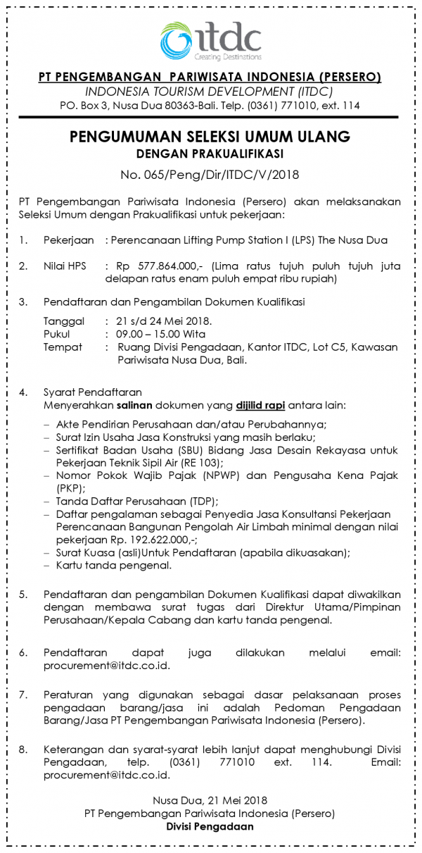 ANNOUNCEMENT OF PUBLIC SELECTION WITH PRA-QUALIFICATION No. 065 / Peng / Dir / ITDC / V / 2018