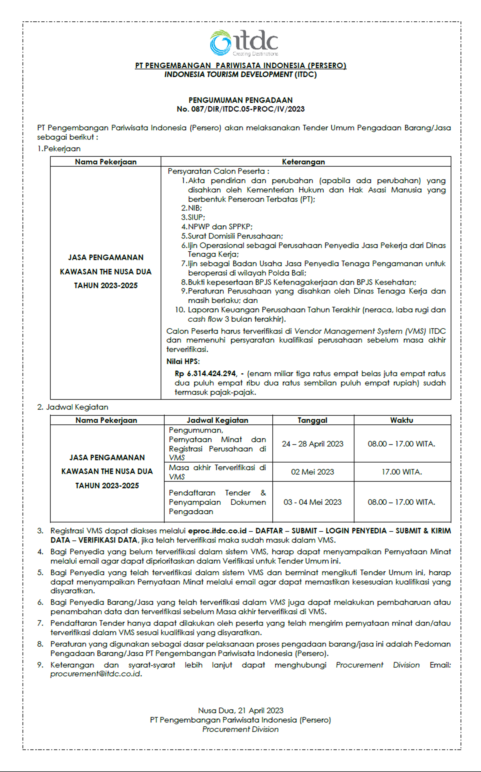 PENGUMUMAN PENGADAAN No. 087/DIR/ITDC.05-PROC/IV/2023