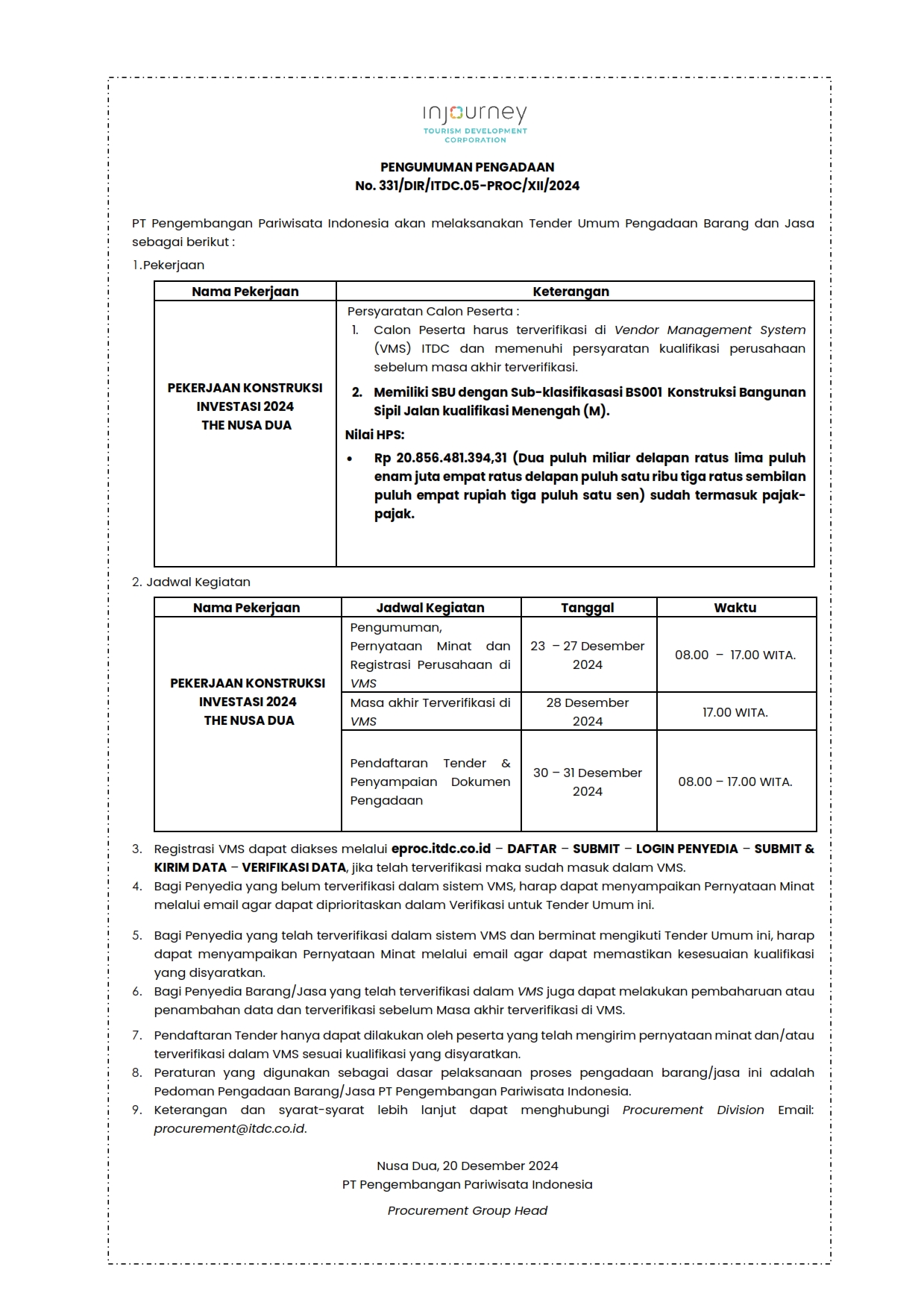 PENGUMUMAN PENGADAAN 331/DIR/ITDC.05-PROC/XII/2024