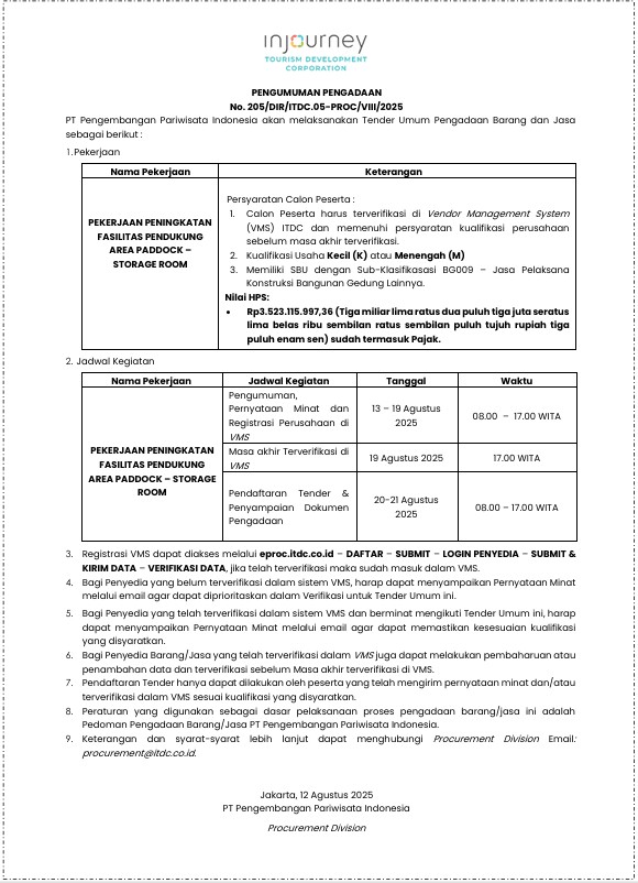 PENGUMUMAN PENGADAAN No. 205/DIR/ITDC.05-PROC/VIII/2025