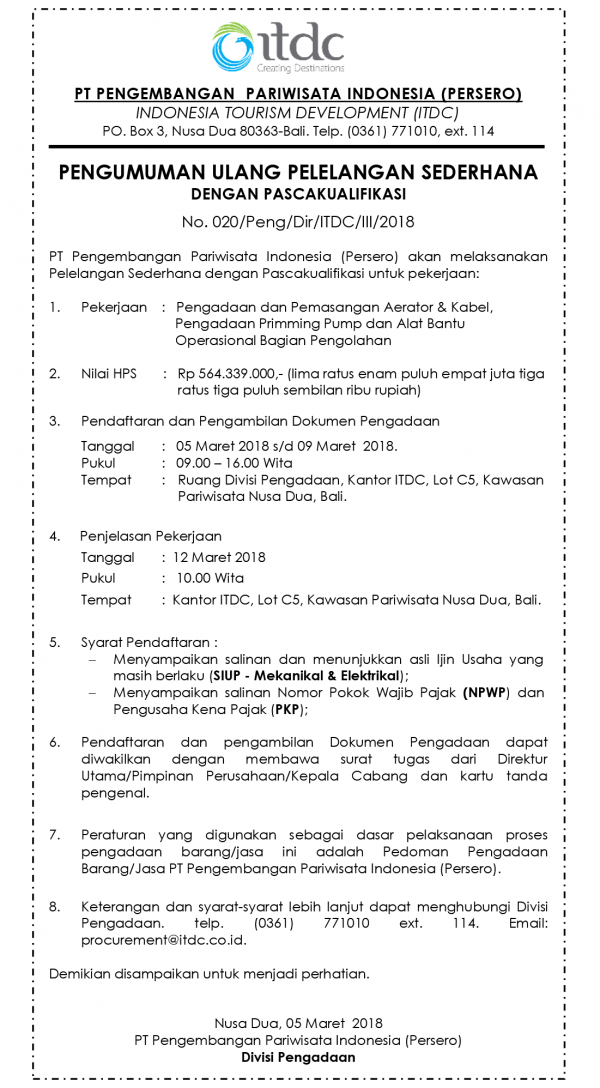 ANNOUNCEMENT OF SIMPLE TENDER AFTER POST-QUALIFICATION No. 020 / Peng / Dir / ITDC / III / 2018