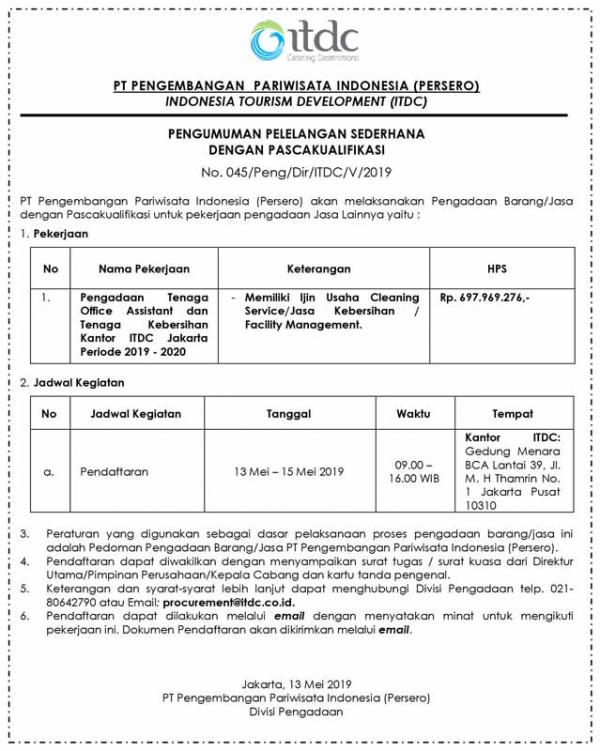 PROCUREMENT OF AN OFFICE ASSISTANT AND CLEANLINESS FOR ITDC OFFICE JAKARTA PERIOD 2019 - 2020