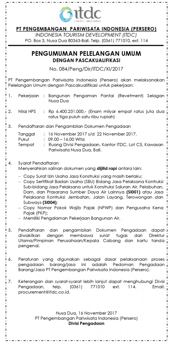 ANNOUNCEMENT OF PUBLIC AUCTION WITH POST QUALIFICATION No.084 / Peng / Dir / ITDC / XI / 2017