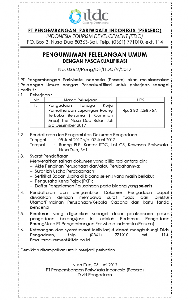 PROCUREMENT OF LABOR MAINTENANCE THE COMMON AREA OF THE NUSA DUA FOR JULY - DECEMBER 2017