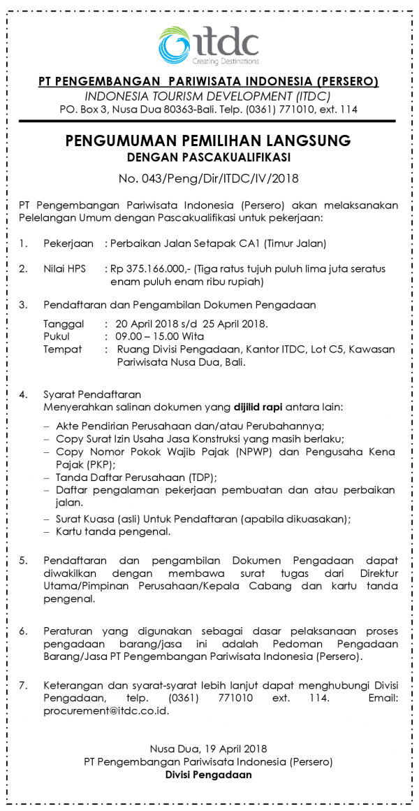 ANNOUNCEMENT OF DIRECT SELECTION BY POST-QUALIFICATION No. 043 / Peng / Dir / ITDC / IV / 2018