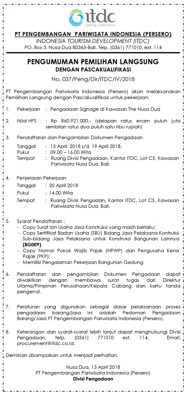 ANNOUNCEMENT OF DIRECT SELECTION BY POST-QUALIFICATION No. 044 / Peng / Dir / ITDC / IV / 2018