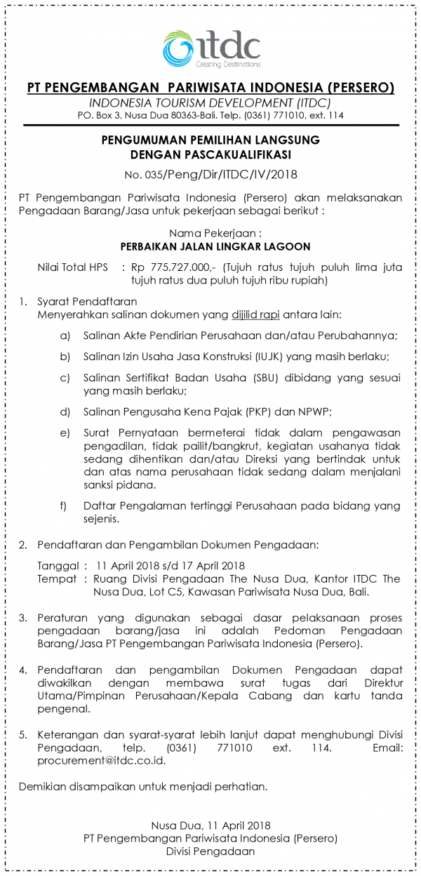 ANNOUNCEMENT OF DIRECT SELECTION BY POST-QUALIFICATION No. 035 / Peng / Dir / ITDC / IV / 2018
