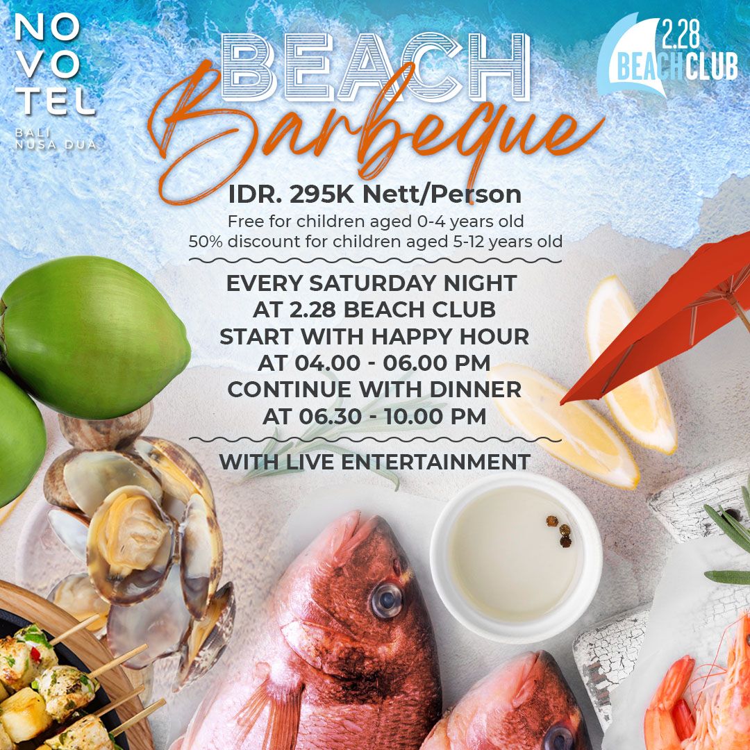 IDR. 295K Nett/PersonFree for children aged 0-4 years old50% discount for children aged 5-12 years old Every SATURDAY night at 2.28 BEACH CLUBstart with happy hour at 04.00 - 06.00 pmcontinue with dinner at 06.30 - 10.00 pmwith LIVE Entertainment For more information and reservation, please contact:The Square Restaurant 0361 - 8480555 ext.765 or WA: 0813-3890-0118Email: fbm@novotelnusaduabali.com