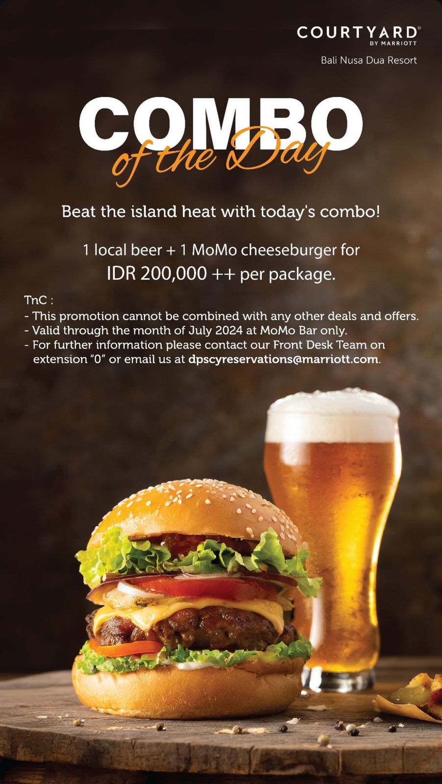 Best the island heat with today's combo!1 local beer + 1 momo cheeseburger forIDR 200.000 ++ per packagetnt- tyhis promotion cannot be combinet with any other deals and offers-Valid trought the mounth of july 2024 at MOMO Bar only-For further information pleasew contact our Front Desk Team on