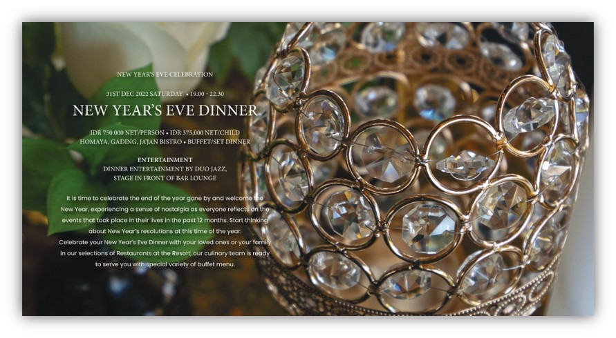 A truly unforgettable celebration awaits as we kick off a brand-new year with festive and lavish dining.Join us on: Saturday, 31th December 2022El Patio Restaurant Unforgettable Festive BuffetEnjoy the pleasant international festive menu with premium selected delicacies and tradition such as foie gras, lamb shoulders, suckling pig, a full seafood market on ice and many more. Make your night even more perfect with the pleasant live music to accompany your dinner.IDR 2,200,000++ per person including free flow of wine and soft drink. Puri Bali Sense of PlaceCelebrate New Year's Eve in Balinese touch.A carefully crafted set menu will satisfy your taste buds. Enjoy the magical moment with the magnificent theatrical performance featuring the beautiful of Indonesia's cultural diversity. Welcome drink and canape start at 7.00 PM and dinner at 8.00 PM.IDR 2,200,000++ per person including welcome drink and canape. Sorrento RestaurantSpend the precious New Year's Eve moment with the lavish 4 courses gourmet menu in the elegant and chic ambiance. Indulge in the intimate atmosphere with the beautiful violin performance.IDR 2,200,000++ per person including wine and soft drink.The prices above are excluded 21% government tax and service.For more information or booking please contact reservation.meliabali@melia.com or WhatsApp +62 811 3867 789