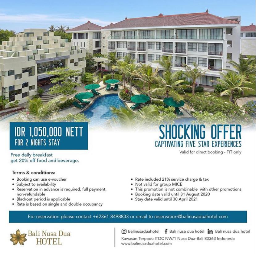 IDR 1.050.000 nett for 2 night stay. Booking date valid until 31 August 2020 and stay date valid until 30 April 2020.Terms and conditions applied.RSVP: reservation@balinusaduahotel.com