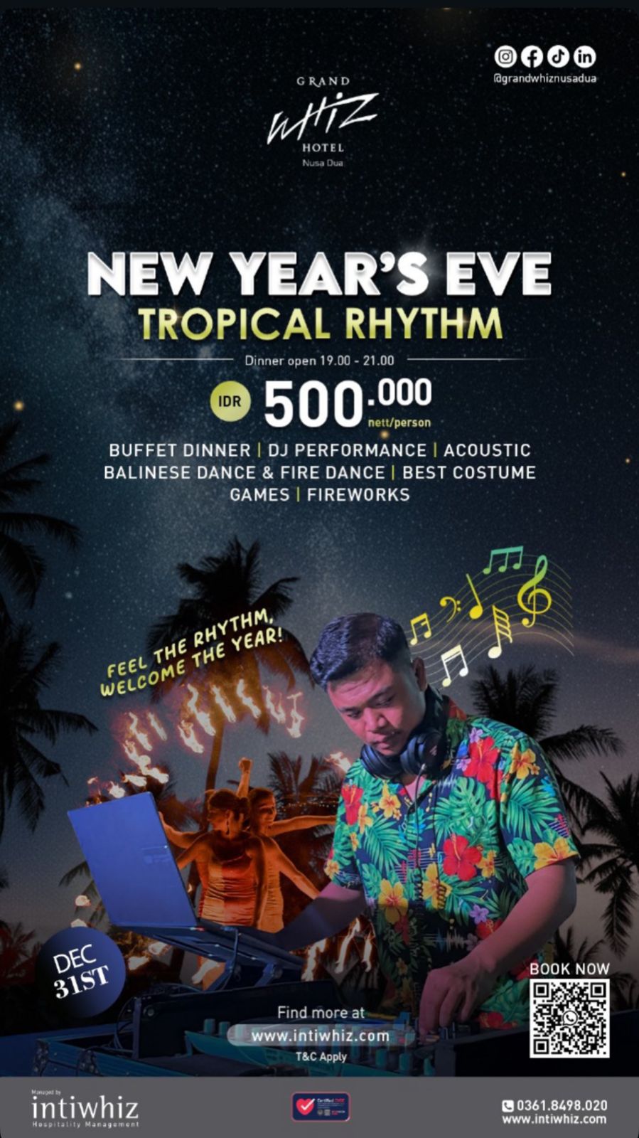 NEW YEAR'S EVE TROPICAL RHYTHMIDR 500.000 nett/personDinner open 19.00 - 21.00BUFFET DINNER | DJ PERFORMANCE | ACOUSTIC BALINESE DANCE & FIRE DANCE | BEST COSTUME GAMES | FIREWORKSFEEL THE RHYTHM, WELCOME THE YEAR!DEC 31STManaged byintiwhiz Hospitality ManagementFind more at www.intiwhiz.com T&C ApplyBOOK NOW0361.8498.020 www.intiwhiz.com