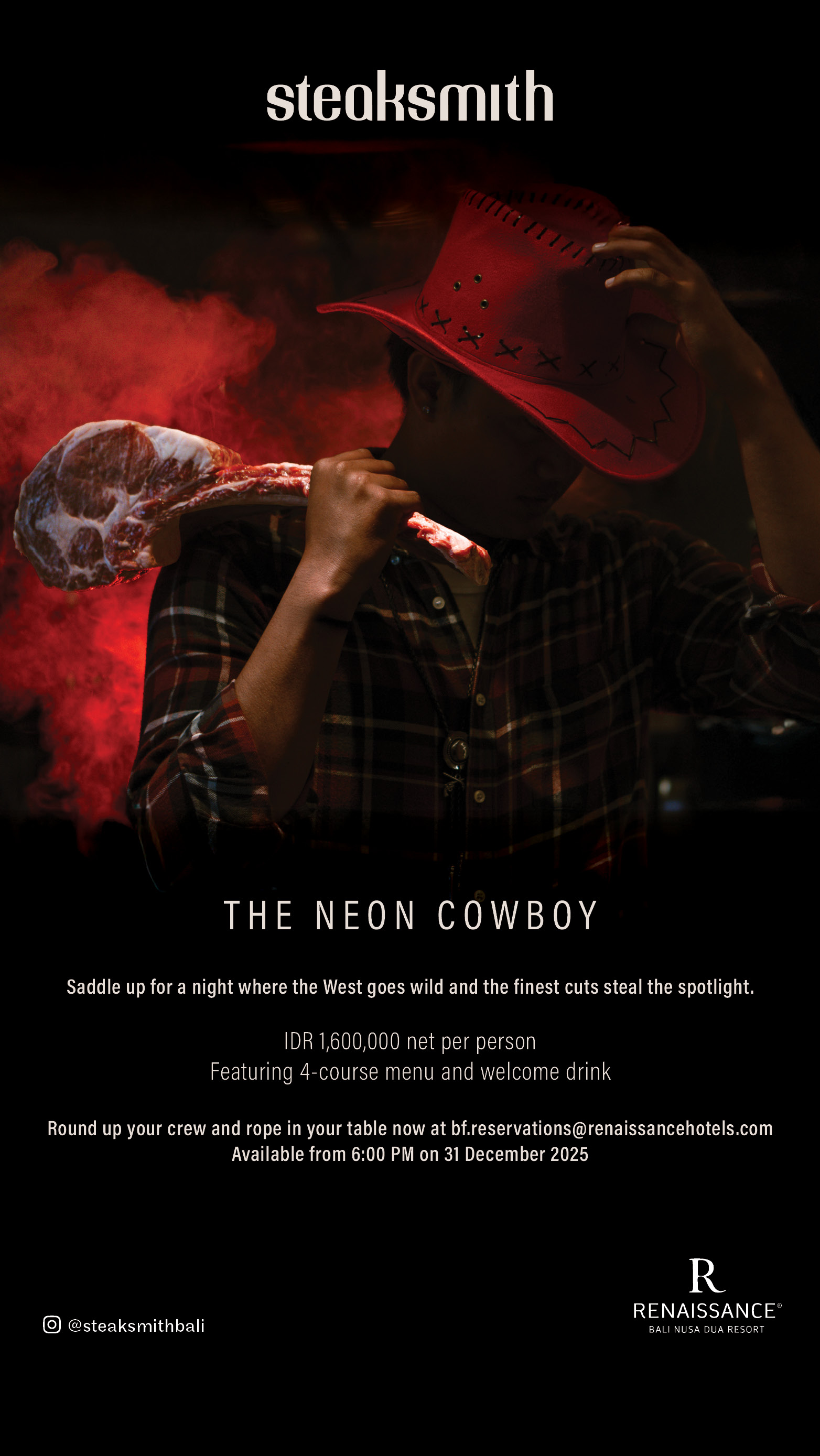 THE NEON COWBOYSaddle up for a night where the West goes wild and the finest cuts steal the spotlight.IDR 1,600,000 net per personFeaturing 4-course menu and welcome drinkRound up your crew and rope in your table now at bf.reservations@renaissancehotels.com Available from 6:00 PM on 31 December 2025@steaksmithbaliRENAISSANCE®BALI NUSA DUA RESORT