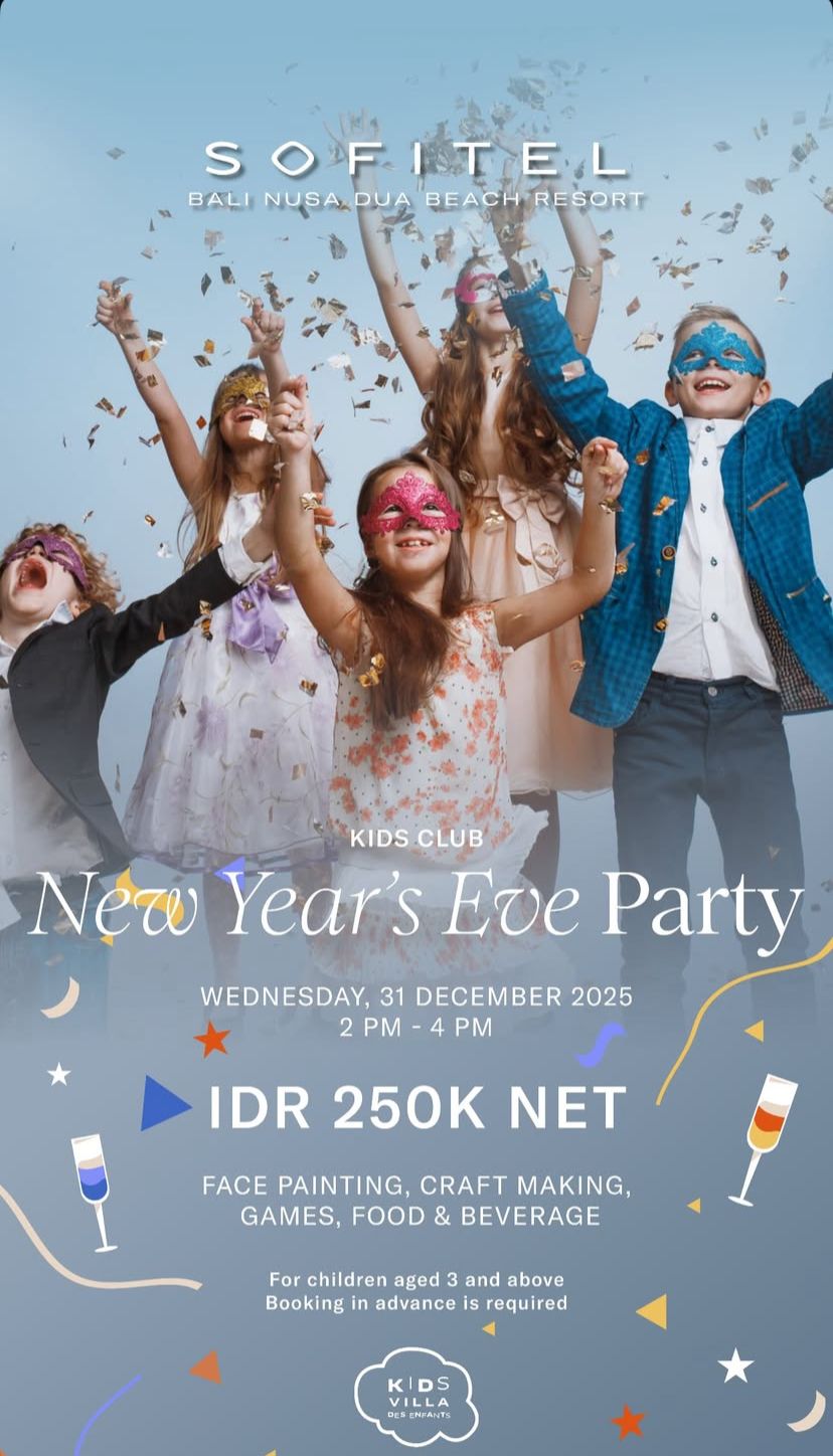 SOFITEL BALI NUSA DUA BEACH RESORT KIDS CLUBNew Year's Eve PartyWEDNESDAY, 31 DECEMBER 2025 2 PM 4 PMIDR 250K NETFACE PAINTING, CRAFT MAKING, GAMES, FOOD & BEVERAGEFor children aged 3 and above Booking in advance is required