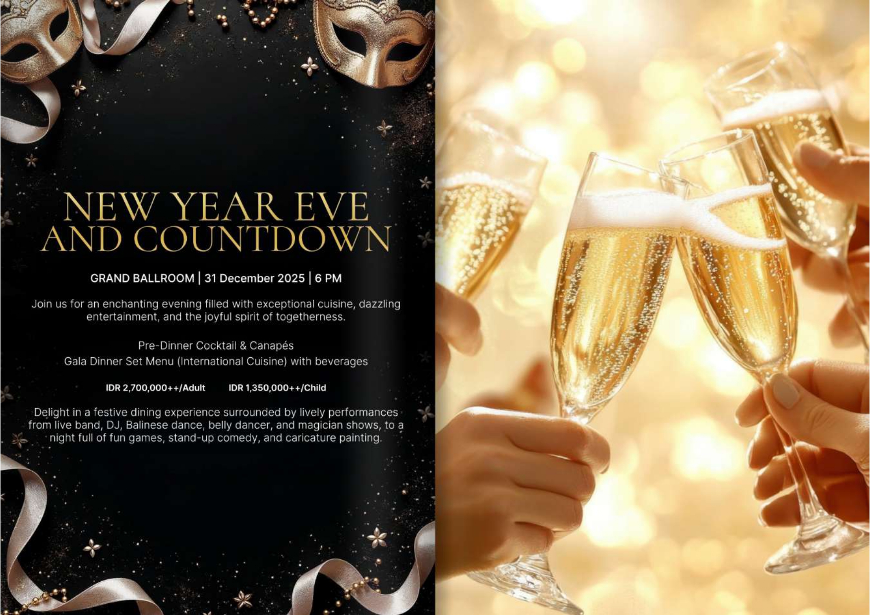 NEW YEAR EVE AND COUNTDOWNGRAND BALLROOM | 31 December 2025 | 6 PMJoin us for an enchanting evening filled with exceptional cuisine, dazzling entertainment, and the joyful spirit of togetherness.Pre-Dinner Cocktail & CanapésGala Dinner Set Menu (International Cuisine) with beveragesIDR 2,700,000++/Adult IDR 1,350,000++/ChildDelight in a festive dining experience surrounded by lively performances from live band, DJ, Balinese dance, belly dancer, and magician shows, to a night full of fun games, stand-up comedy, and caricature painting.