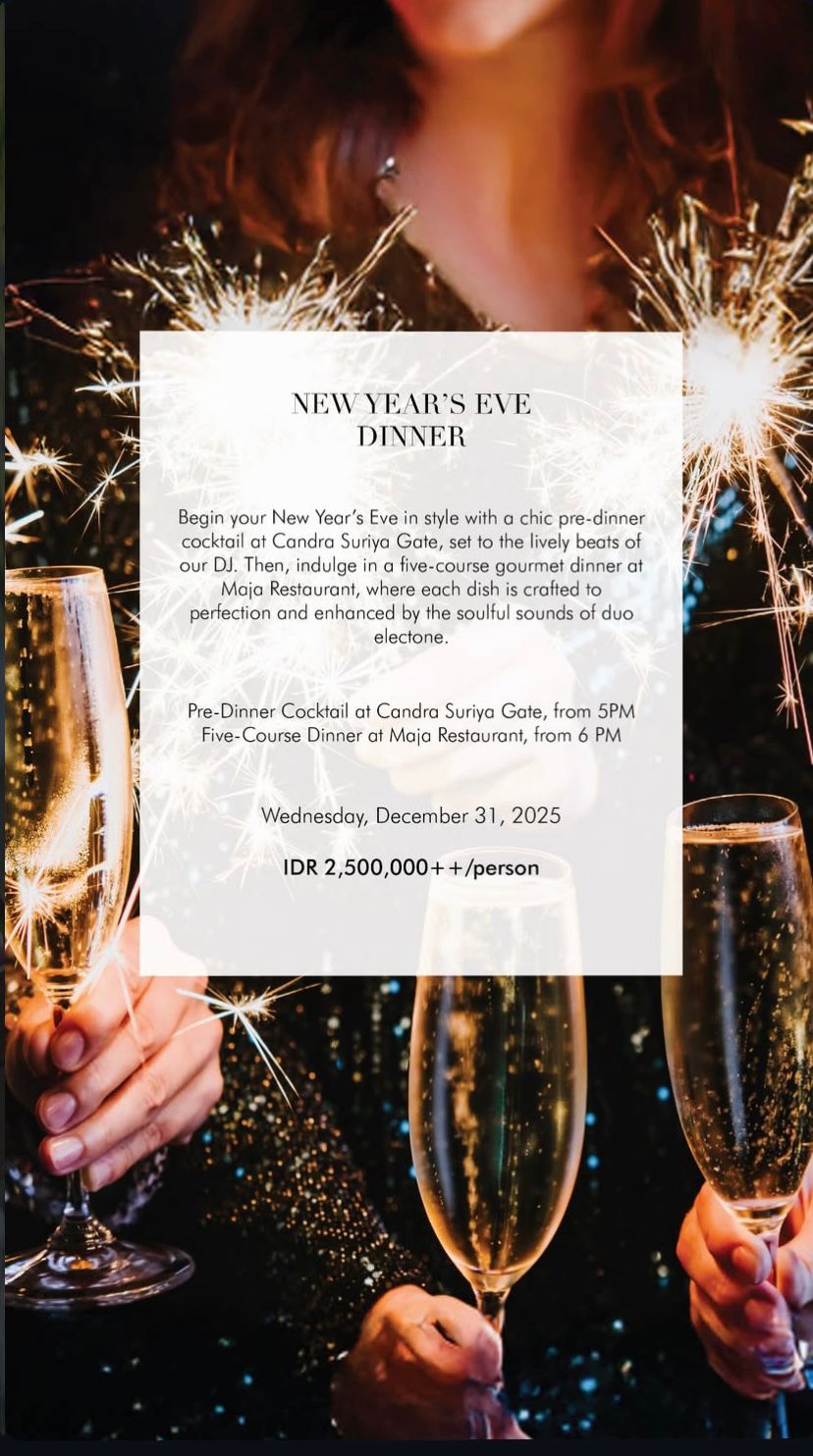 NEW YEAR'S EVE DINNERBegin your New Year's Eve in style with a chic pre-dinner cocktail at Candra Suriya Gate, set to the lively beats of our DJ. Then, indulge in a five-course gourmet dinner at Maja Restaurant, where each dish is crafted to perfection and enhanced by the soulful sounds of duo electone.Pre-Dinner Cocktail at Candra Suriya Gate, from 5PMFive-Course Dinner at Maja Restaurant, from 6 PMWednesday, December 31, 2025IDR 2,500,000 + +/person