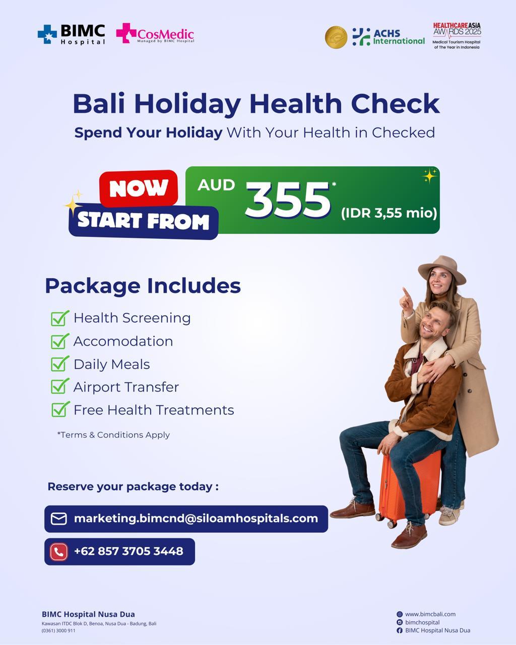 Bali Holiday Health CheckSpend Your Holiday With Your Health in CheckedSTART FROM NOW AUD 355 (IDR 3,55 mio)Package IncludesHealth ScreeningAccomodationDaily MealsAirport TransferFree Health Treatments*Terms & Conditions ApplyReserve your package today:marketing.bimcnd@siloamhospitals.com+62 857 3705 3448BIMC Hospital Nusa DuaKawasan ITDC Blok D, Benoa, Nusa Dua - Badung, Bali (0361) 3000 911
