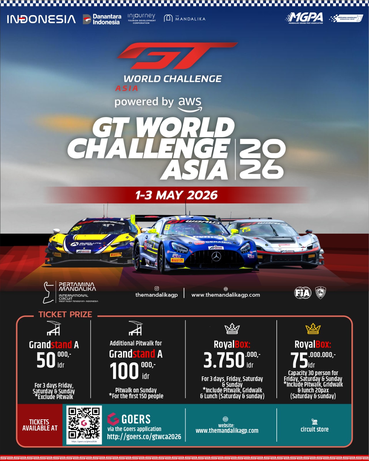 The Mandalika, 15 April 2026 – Kabar baik bagi para pecinta motorsport, tiket ajang balap GT World Challenge Asia 2026 yang akan digelar pada 1–3 Mei 2026 di Pertamina Mandalika International Circuit, Lombok, Nusa Tenggara Barat, masih tersedia dan dapat dibeli secara online. Tiket dapat dibeli melalui aplikasi Goers di tautan http://goers.co/gtwca2026 , situs resmi www.themandalikagp.com , aplikasi MyTelkomsel, serta pembelian langsung di Mandalika Circuit Store.Ajang balap mobil bergengsi ini tidak hanya menghadirkan kompetisi kelas dunia, tetapi juga menciptakan pengalaman dunia motorsport yang dikemas dalam konsep “Mandalika Festival of Speed”, dengan menyuguhkan rangkaian balapan, hiburan, serta aktivitas interaktif selama tiga hari penuh bagi masyarakat luas.Mengusung konsep festival, “Mandalika Festival of Speed” bukan cuma menghadirkan balapan internasional, tapi juga diramaikan berbagai ajang nasional yang memperkuat atmosfer kompetisi di lintasan. Beberapa di antaranya adalah Krida Agya Mandalika Kartini Race 2026 yang menjadi simbol semangat emansipasi perempuan di dunia otomotif, Subaru BRZ Super Series dengan persaingan mobil sport yang kompetitif, serta Time Attack yang menguji kecepatan terbaik para pembalap dalam satu putaran.Direktur Utama MGPA Priandhi Satria, mengajak masyarakat untuk tidak melewatkan kesempatan langka ini. Menurutnya, menyaksikan langsung balapan di sirkuit memberikan sensasi yang jauh lebih imersif dibandingkan menyaksikan melalui layar.“Ini adalah kesempatan bagi masyarakat Indonesia untuk menikmati langsung suasana balap internasional di tanah air. Kami mengundang seluruh pecinta otomotif dan masyarakat luas untuk datang ke The Mandalika dan menjadi bagian dari euforia GT World Challenge Asia 2026,” ujar Priandhi Satria.Tiket Mulai Rp50.000, Tersedia Beragam Kategori dan FasilitasTiket 3 Days Pass GT World Challenge Asia 2026 tersedia dalam beberapa kategori sesuai dengan preferensi penonton.Kategori Grandstand A ditawarkan dengan harga Rp50.000, menjadikannya pilihan terjangkau bagi masyarakat luas. Selain itu, tersedia tambahan akses pit walk seharga Rp100.000 yang terbatas untuk 150 pembeli pertama.Bagi penonton yang menginginkan kenyamanan dan pengalaman eksklusif, tersedia kategori Royal Box dengan harga Rp3.750.000, serta paket grup maksimal 30 orang seharga Rp75.000.000. Fasilitas yang didapatkan meliputi lunch and refreshments, serta akses eksklusif seperti grid walk, pit walk, and paddock access, yang memungkinkan penonton melihat langsung aktivitas tim dan mobil balap dari jarak dekat.Selama tiga hari, penonton akan disuguhkan rangkaian lengkap mulai dari sesi latihan, kualifikasi, hingga balapan utama. Ini memberikan pengalaman menyeluruh dalam menikmati dinamika sebuah ajang balap internasional, dari persiapan awal hingga puncak.Dengan kombinasi balap internasional, kompetisi ajang nasional, pengalaman festival otomotif yang komprehensif, GT World Challenge Asia 2026 di Pertamina Mandalika International Circuit jadi momentum yang sayang untuk dilewatkan.Penyelenggaraan event ini tidak hanya bicara tentang hiburan, tapi juga jadi bagian dari upaya mendorong pertumbuhan motorsport nasional serta memperkuat posisi The Mandalika sebagai destinasi sport tourism unggulan Indonesia.Pantau terus informasi terbaru melalui:Instagram.com/themandalikagpfacebook.com/themandalikagpyoutube.com/@themandalikagptiktok.com/@themandalikagplinkedin.com/company/themandalikagp