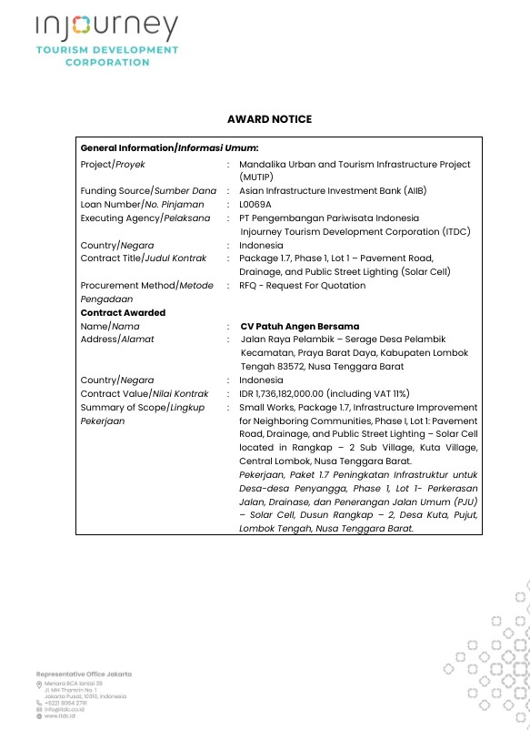 AWARD ANNOUNCEMENT Package 1.7, Phase 1, Lot 1 – Pavement Road, Drainage, and Public Street Lighting (Solar Cell) Click here