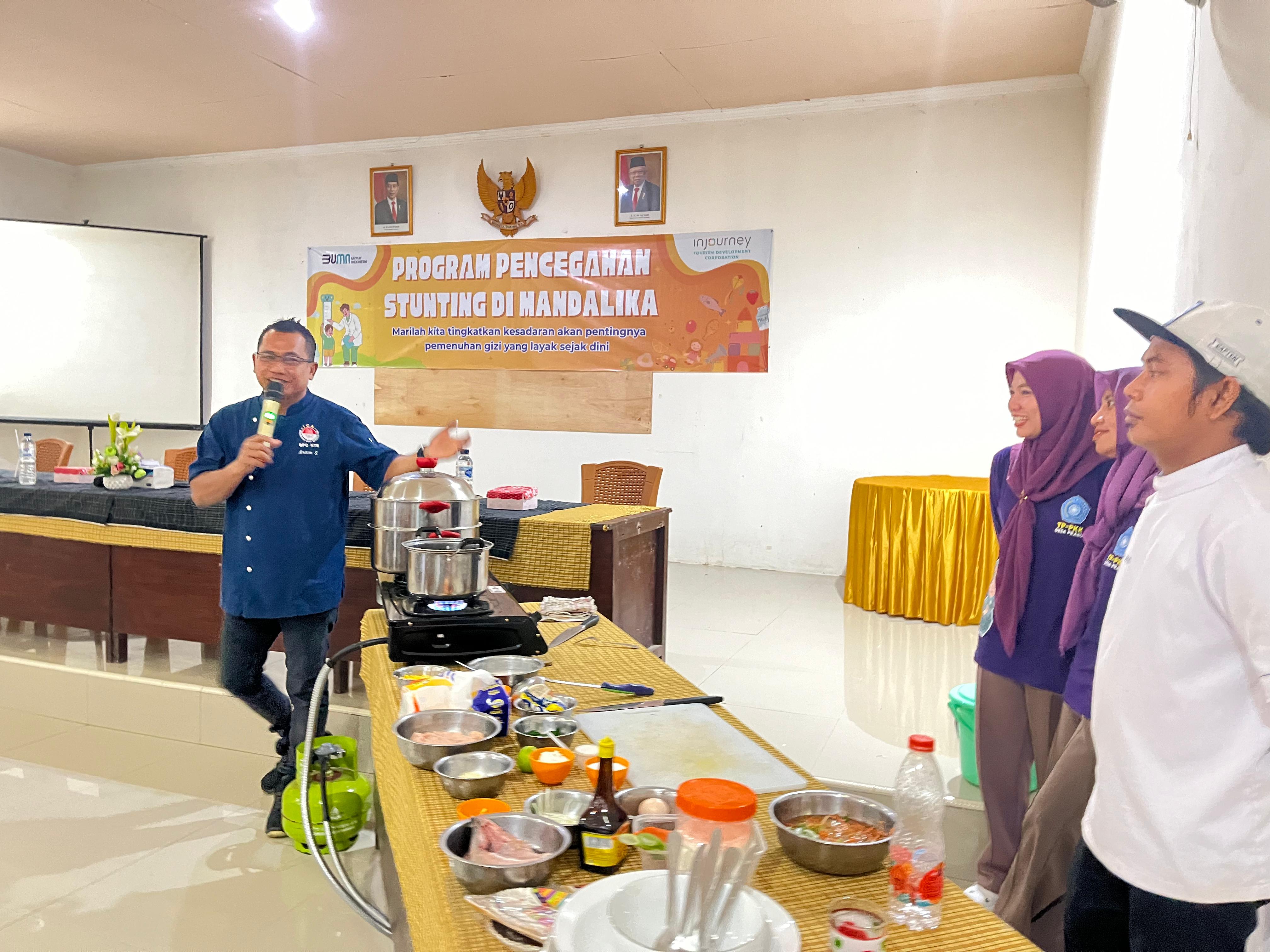 In implementing this program, ITDC has been collaborated with some key stakeholders, including the Lombok Tengah Regency Family Welfare Empowerment (PKK), Prabu Village Government, Kuta Health Center, and the Indonesia Chef Association of NTB Province. The highlight of this program is the involvement of Chef Anton Sugiono, NTB's Ambassador for Stunting Prevention, who provides cooking education for healthy and nutritious meals in coordination with nutritionists from the Kuta Health Center.