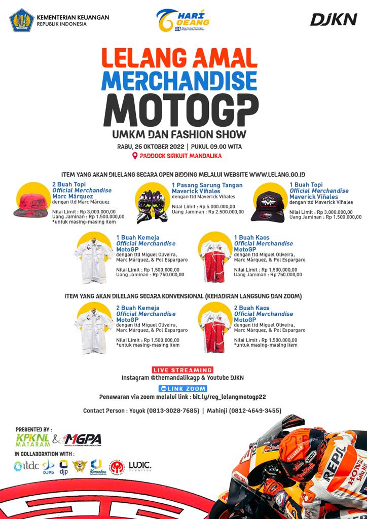 Lombok, 14 Oktober 2022 - Kantor Pelayanan Kekayaan Negara dan Lelang (KPKNL) Mataram yang merupakan kantor vertikal Direktorat Jenderal Kekayaan Negara (DJKN) Kementerian Keuangan bekerja sama dengan Mandalika Grand Prix Association (MGPA) akan melelang sepuluh buah official merchandise dari para pembalap yang berlaga di Pertamina Grand Prix of Indonesia (MotoGP) di Pertamina Mandalika Circuit, Lombok, NTB, 18-20 Maret lalu.
