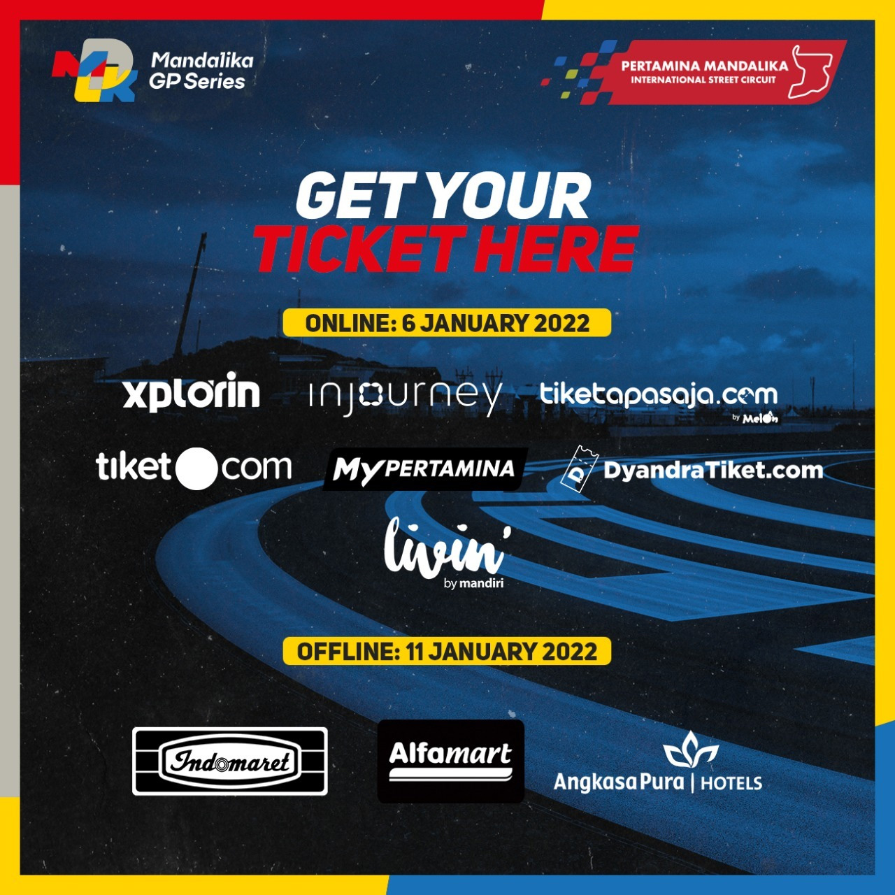 Tiket MotoGP di The Mandalika dijual secara online melalui sejumlah official partner, antara lain My Pertamina Apps, InJourney, Xplorin yang didukung oleh Bank NTB Syariah, Livin’ by Mandiri, Tiketapasaja.com, Tiket.com, dan DyandraTiket.com sejak 6 Januari 2022 lalu.