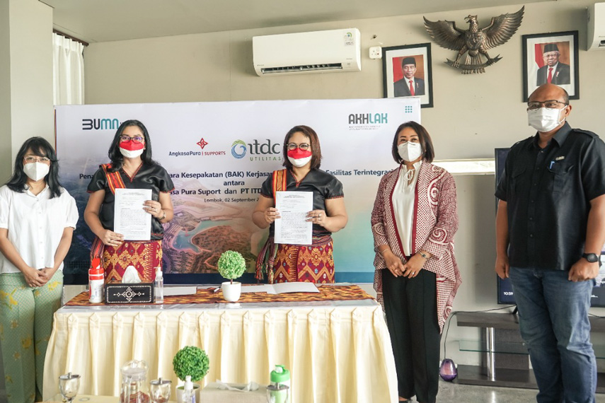 The Mandalika, 2 September 2021 - PT ITDC Nusantara Utilitas (ITDC NU) anak usaha dari PT Pengembangan Pariwisata Indonesia (Persero) atau Indonesia Tourism Development Corporation/ITDC, yang bergerak di bidang utilitas, pada hari Kamis, 2 September 2021 melangsungkan penandatanganan Berita Acara Kesepakatan (BAK) Kerjasama Pengelolaan Fasilitas Terintegrasi dengan PT Angkasa Pura Support (APS), anak usaha PT Angkasa Pura I (Persero) yang bergerak pada bidang penyediaan barang dan/jasa secara umum. BAK ini merupakan bentuk tindak lanjut dari penandatanganan nota kesepahaman antara ITDC NU bersama dengan APS pada bulan Februari 2021 lalu.