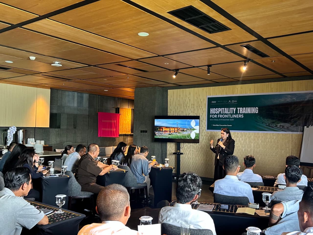 Sebanyak 38 personel lintas fungsi yang berinteraksi langsung dengan tamu, antara lain unit keamanan di bagian gerbang, operasional, banquet, housekeeping, hingga landscape, mengikuti pelatihan untuk memperkuat service mindset, keterampilan komunikasi, penerapan standar hospitality, dan pemahaman menyeluruh terhadap customer journey.