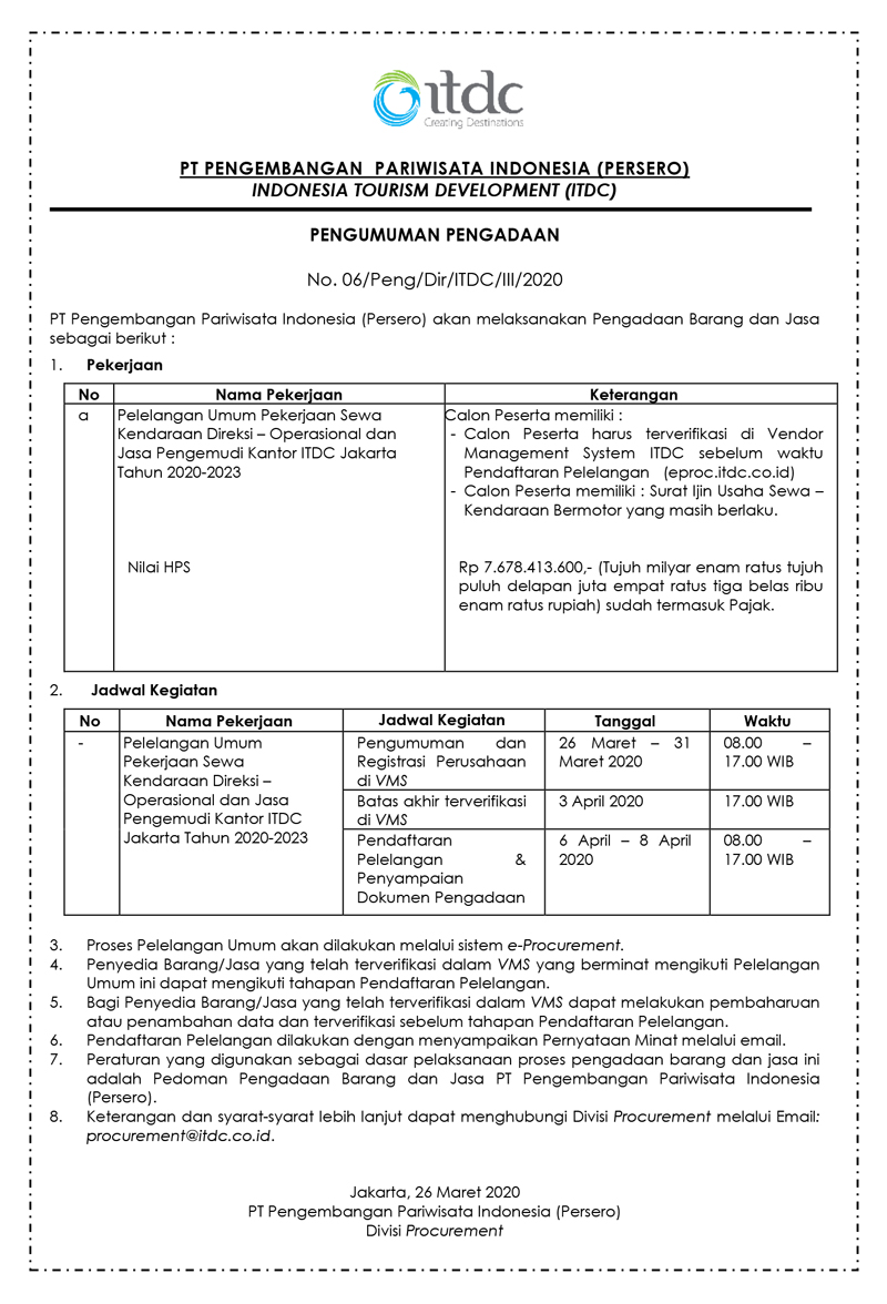 Pelelangan Umum Pekerjaan Sewa Kendaraan Direksi – Operasional dan Jasa Pengemudi Kantor ITDC Jakarta Tahun 2020-2023