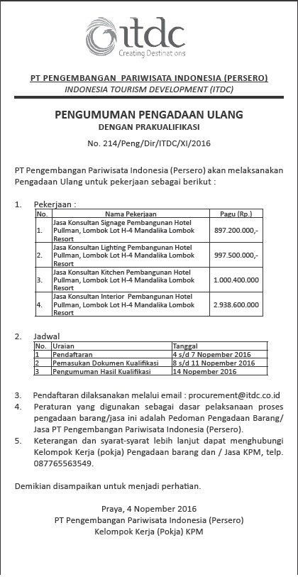 ANNOUNCEMENT OF PROCUREMENT OF GOODS / SERVICES 4 NOVEMBER 2016