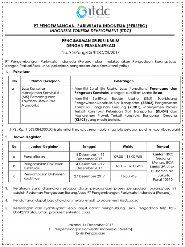 ANNOUNCEMENT OF GENERAL SELECTION WITH PRAKUALIFICATION No. 95 / Peng / Dir / ITDC / XII / 2017