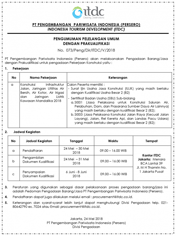 ANNOUNCEMENT OF GENERAL AUCTION WITH PRAKUALIFICATION No. 073 / Peng / Dir / ITDC / V / 2018