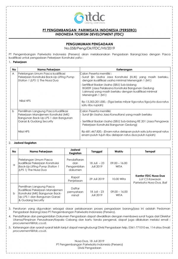 PROCUREMENT ANNOUNCEMENT No.058/Peng/Dir/ITDC/VII/2019