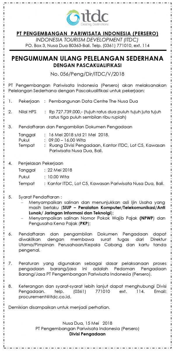 ANNOUNCEMENT OF SIMPLE TENDER AFTER POST-QUALIFICATION No. 056 / Peng / Dir / ITDC / V / 2018